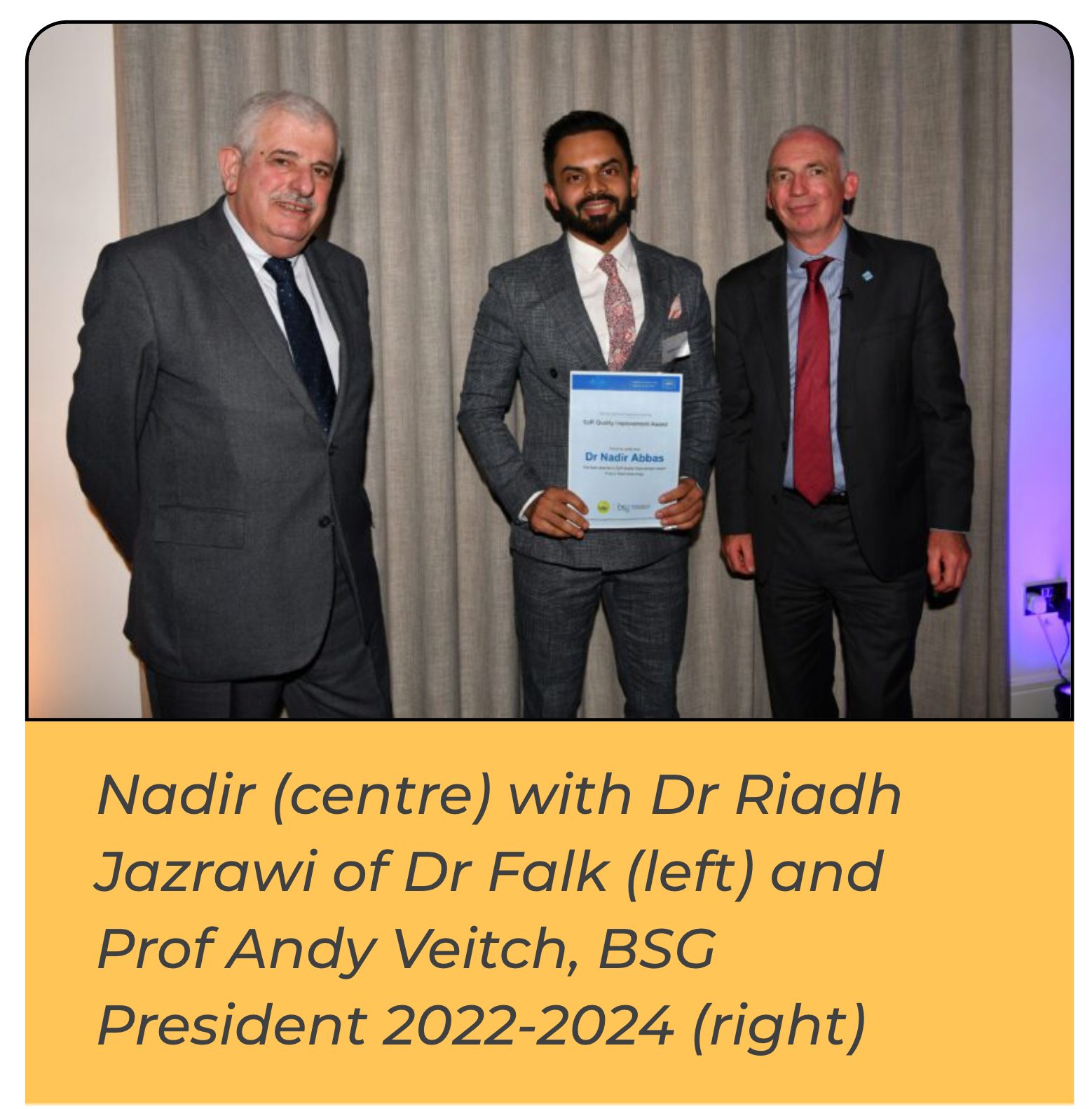 Nadir (centre) with Dr Riadh Jazrawi of Dr Falk (left) and Prof Andy Veitch, BSG President 2022–2024 (right)